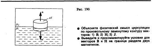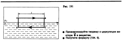 Вблизи границы раздела двух магнетиков 1 и 2 построим небольшой замкнутый прямоугольный контур ABCDA длиной l, ориентировав его так, как показано на рис.191. Согласно теореме (133.10) о циркуляции вектора Н,