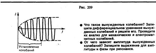 (см. (146.5)) и частного решения (147.11). Слагаемое (147.12) играет существенную роль только в начальной стадии процесса (при установлении колебаний) до тех пор, пока амплитуда вынужденных колебаний не достигнет значения, определяемого равенством (147.8). Графически вынужденные колебания представлены на рис. 209. Следовательно, в установившемся режиме вынужденные колебания происходят с частотой w и являются гармоническими; амплитуда и фаза колебаний, определяемые выражениями (147.8) и (147.9), также зависят от w.