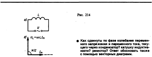 Сравнение выражений (149.4) и (149.6) приводит к выводу, что падение напряжения UL опережает по фазе ток I, текущий через катушку, на p /2, что и показано на векторной диаграмме (рис. 214, б).