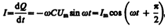 3. Переменный ток, текущий через конденсатор емкостью С (R ®0, L ®0) (рис. 215, в). Если переменное напряжение (149.1) приложено к конденсатору, то он все время перезаряжается, и в цепи течет переменный ток. Так как все внешнее напряжение приложено к конденсатору, а сопротивлением подводящих проводов можно пренебречь, то