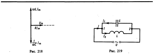 Рассмотрим цепь переменного тока, содержащую параллельно включенные конденсатор емкостью С и катушку индуктивностью L (рис. 219). Для простоты допустим, что активное сопротивление обеих ветвей настолько мало, что им можно пренебречь. Если приложенное напряжение изменяется по закону U= U m сos w t (см. (149.1)), то, согласно формуле (149.11),в ветви 1С2 течет ток