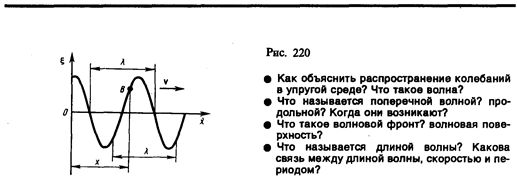 Расстояние между ближайшими частицами, колеблющимися в одинаковой фазе, называется длиной волны l (рис. 220). Длина волны равна тому расстоянию, на которое распространяется определенная фаза колебания за период, т. е.