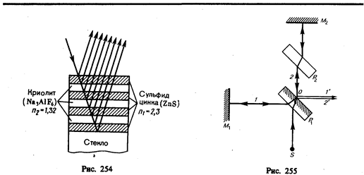 Многолучевую интерференцию можно осуществить в многослойной системе чередующихся пленок с разными показателями преломления (но одинаковой оптической толщиной, равной l 0/4), нанесенных на отражающую поверхность (рис. 254). Можно показать, что на границе раздела пленок (между двумя слоями ZnS с большим показателем преломления п 1 находится пленка криолита с меньшим показателем преломления n 2) возникает большое число отраженных интерферирующих лучей, которые при оптической толщине пленок l 0/4 будут взаимно усиливаться, т. е. коэффициент отражения возрастает. Характерной особенностью такой высокоотражательной системы является то, что она действует в очень узкой спектральной области, причем чем больше коэффициент отражения, тем уже эта область. Например, системаиз семипленок для области 0,5мкм дает коэффициент отражения r»96% (при коэффициенте пропускания»3,5% и коэффициенте поглощения <0,5%). Подобные отражатели применяются в лазерной технике, а также используются для создания интерференционных светофильтров (узкополосных оптических фильтров).