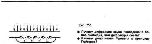 Пусть плоская волна нормально падает на отверстие в непрозрачном экране (рис. 256). Согласно Гюйгенсу, каждая точка выделяемого отверстием участка волнового фронта служит источником вторичных волн (в однородной изотропной среде они сферические). Построив огибающую вторичных волн для некоторого момента времени, видим, что фронт волны заходит в область геометрической тени, т. е. волна огибает края отверстия.