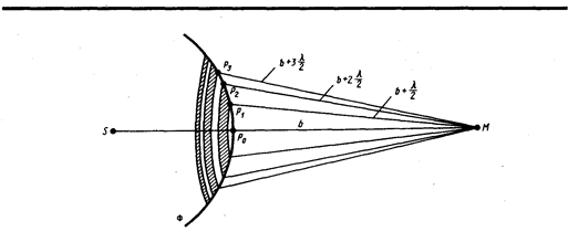 Найдем в произвольной точке М амплитуду световой волны, распространяющейся в однородной среде из точечного источника S (рис. 257). Согласно принципу Гюйгенса — Френеля, заменим действие источника S действием воображаемых источников, расположенных на вспомогательной поверхности Ф, являющейся поверхностью фронта волны, идущей из S (поверхность сферы с центром S). Френель разбил волновую поверхность Ф на кольцевые зоны такого размера, чтобы расстояния от краев зоны до М отличались на l /2, т. е. Р 1 М – Р 0 М = Р 2 М – Р 1 М = Р 3 М – Р 2 М =... = l /2. Подобное разбиение фронта волны на зоны можно выполнить, проведя с центром в точке М сферы радиусами b +