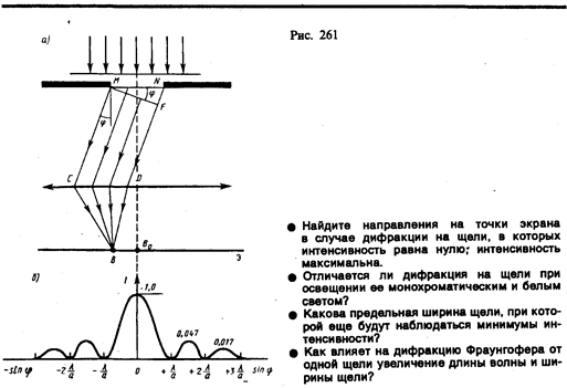 Рассмотрим дифракцию Фраунгофера от бесконечно длинной щели (для этого практически достаточно, чтобы длина щели была значительно больше ее ширины). Пусть плоская монохроматическая световая волна падает нормально плоскости узкой щели шириной а (рис. 261, а). Оптическая разность хода между крайними лучами МС и ND, идущими от щели в произвольном направлении j,