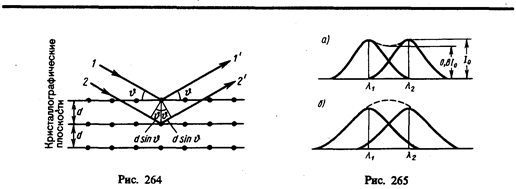 1. Наблюдая дифракцию рентгеновских лучей известной длины волны на кристаллической структуре неизвестного строения и измеряя q и т, можно найти межплоскостное расстояние (d), т.е. определить структуру вещества. Этот метод лежит в основе рентгеноструктурного анализа. Формула Вульфа — Брэггов остается справедливой и при дифракции электронов и нейтронов. Методы исследования структуры вещества, основанные на дифракции электронов и нейтронов, называются соответственно электронографией и нейтронографией.