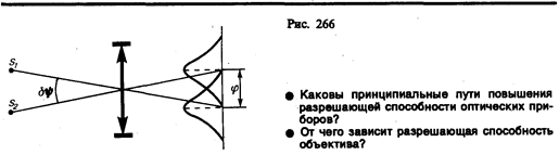 1. Разрешающая способность объектива. Если на объектив падает свет от двух удаленных точечных источников S 1 и S 2 (например, звезд) с некоторым угловым расстоянием dy, то вследствие дифракции световых волн на краях диафрагмы, ограничивающей объектив, в его фокальной плоскости вместо двух точек наблюдаются максимумы, окруженные чередующимися темными и светлыми кольцами (рис. 266).Можно доказать, что две близлежащие звезды, наблюдаемые в объективе в монохроматическом свете, разрешимы, если угловое расстояние между ними