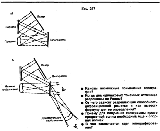 Для восстановления изображения (рис. 267, б) голограмма помещается в то же самое положение, где она находилась до регистрации. Ее освещают опорным пучком того же лазера (вторая часть лазерного пучка перекрывается диафрагмой). В результате дифракции света на интерференционной структуре голограммы восстанавливается копия предметной волны, образующая объемное (со всеми присущими предмету свойствами) мнимое изображение предмета, расположенное в том месте, где предмет находился при голографировании. Оно кажется настолько реальным, что его хочется потрогать. Кроме того, восстанавливается еще действительное изображение предмета, имеющее рельеф, обратный рельефу предмета, т. е. выпуклые места заменены вогнутыми, и наоборот (если наблюдение ведется справа от голограммы).