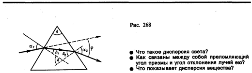 Рассмотрим дисперсию света в призме. Пусть монохроматический пучок света падает на призму с преломляющим углом А и показателем преломления п (рис. 268) под углом a1. После двукратного преломления (на левой и правой гранях призмы) луч оказывается отклоненным от первоначального направления на угол j. Из рисунка следует, что