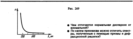 1. Дифракционная решетка разлагает падающий свет непосредственно по длинам воли (см. (180.3)), поэтому по измеренным углам (по направлениям соответствующих максимумов) можно вычислить длину волны. Разложение света в спектр в призме происходит по значениям показателя преломления, поэтому для определения длины волны света надо знать зависимость n = f (l) (185.1).