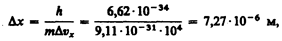Предположим, пучок электронов движется вдоль оси х со скоростью v =108 м/с, определяемой с точностью до 0,01% (D vx» 104 м/с). Какова точность определения координаты электрона? По формуле (215.4),