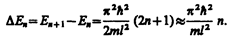 т. е. стационарное уравнение Шредингера, описывающее движение частицы в «потенциальной яме» с бесконечно высокими «стенками», удовлетворяется только при собственных значениях Еn, зависящих от целого числа п. Следовательно, энергия Еn частицы в «потенциальной яме» с бесконечно высокими «стенками» принимает лишь определенные дискретные значения, т.е. квантуется. Квантованные значения энергии Еn называются уровнями энергии, а число п, определяющее энергетические уровни частицы, называется главным квантовым числом. Таким образом, микрочастица в «потенциальной яме» с бесконечно высокими «стенками» может находиться только на определенном энергетическом уровне Еn, или, как говорят, частица находится в квантовом состоянии n.