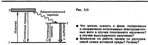 Как отмечалось выше, атомы могут находиться лишь в квантовых состояниях с дискретными значениями энергии Е 1, Е 2, Е 3 ,... Ради простоты рассмотрим только два из этих состояний (1 и 2) с энергиями Е 1 и Е 2. Если атом находится в основном состоянии 1, то под действием внешнего излучения может осуществиться вынужденный переход в возбужденное состояние 2 (рис. 309, а), приводящий к поглощению излучения. Вероятность подобных переходов пропорциональна плотности излучения, вызывающего эти переходы.