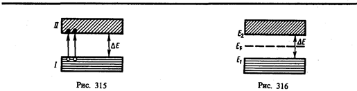 где С 2 — постоянная, зависящая от температуры и эффективной массы дырки, Е 1 — энергия, соответствующая верхней границе валентной зоны. Энергия возбуждения в данном случае отсчитывается вниз от уровня Ферми (рис. 316), поэтому величины в экспоненциальном множителе (242.3) имеют знак, обратный знаку экспоненциального множителя в (242.2). Так как для собственного полупроводника пe=np (242.1), то