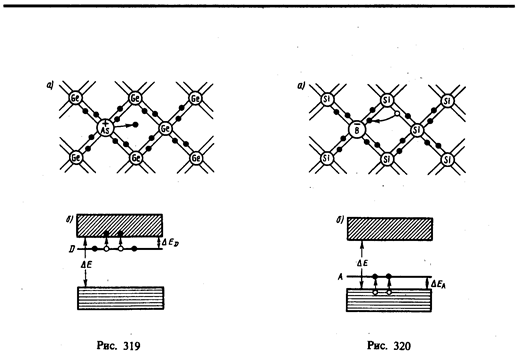 Примесную проводимость полупроводников рассмотрим на примере Ge и Si, в которые вводятся атомы с валентностью, отличной от валентности основных атомов на единицу. Например, при замещении атома германия пятивалентным атомом мышьяка (рис. 319, а) один электрон не может образовать ковалентной связи, он оказывается лишним и может быть легко при тепловых колебаниях решетки отщеплен от атома, т. е. стать свободным. Образование свободного электрона не сопровождается нарушением ковалентной связи; следовательно, в отличие от случая, рассмотренного в § 242, дырка не возникает. Избыточный положительный заряд, возникающий вблизи атома примеси, связан с атомом примеси и поэтому перемещаться по решетке не может.