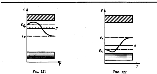 Уровень Ферми в полупроводниках р- типа при 0 К ЕF0 располагается посередине между потолком валентной зоны и акцепторным уровнем (рис. 322). Сплошная кривая опять-таки показывает его смещение с температурой. При температурах, при которых примесные атомы оказываются полностью истощенными и увеличение концентрации носителей происходит за счет возбуждения собственных носителей, уровень Ферми располагается посередине запрещенной зоны, как в собственном полупроводнике.