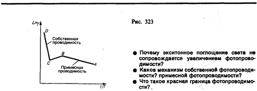Если полупроводник содержит примеси, то фотопроводимость может возникать и при hn < D E: для полупроводников с донорной примесью фотон должен обладать энергией hn ³ D ЕD, а для полупроводников с акцепторной примесью — hn ³ D ЕA. При поглощении света примесными центрами происходит переход электронов с донорных уровней в зону проводимости в случае полупроводника n -типа (рис. 324, б) или из валентной зоны на акцепторные уровни в случае полупроводника p -типа (рис. 324, в). В результате возникает примесная фотопроводимость, являющаяся чисто электронной для полупроводников п -типа и чисто дырочной для полупроводников p -типа.