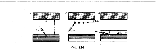 Фотопроводимость (см. § 202) полупроводников — увеличение электропроводности полупроводников под действием электромагнитного излучения — может быть связана со свойствами как основного вещества, так и содержащихся в нем примесей. В первом случае при поглощении фотонов, соответствующих собственной полосе поглощения полупроводника, т. е. когда энергия фотонов равна или больше ширины запрещенной зоны (hn ³ D E), могут совершаться перебросы электронов из валентной зоны в зону проводимости (рис. 324, а), что приведет к появлению добавочных (неравновесных) электронов (в зоне проводимости) и дырок (в валентной зоне). В результате возникает собственная фотопроводимость, обусловленная как электронами, так и дырками.