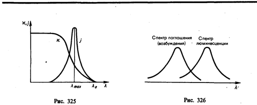 Первое количественное исследование люминесценции проведено более ста лет назад Дж. Стоксом,* сформулировавшим в 1852 г. следующее правило: длина волны люминесцентного излучения всегда больше длины волны света, возбудившего его (рис. 326). Согласно квантовой теории, правило Стокса означает, что энергия hn падающего фотона частично расходуется на какие-то неоптические процессы, т. е.