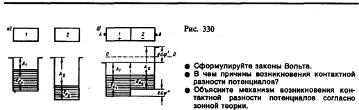 Если, например, привести в соприкосновение три разнородных проводника, имеющих одинаковую температуру, то разность потенциалов между концами разомкнутой цепи равна алгебраической сумме скачков потенциала во всех контактах. Она, как можно показать (предоставляем это сделать читателю), не зависит от природы промежуточных проводников (второй закон Вольта).
