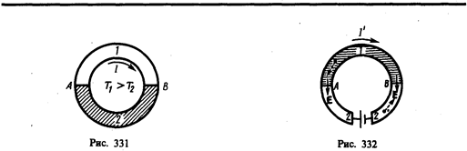 Рассмотрим замкнутую цепь, состоящую из двух металлических проводников 1 и 2 с температурами спаев Т 1 (контакт А) и Т 2 (контакт В), причем Т 1 > T 2 (рис. 331).