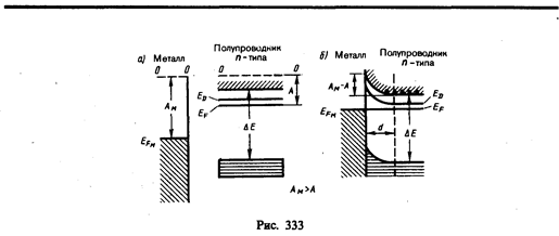 Помимо рассмотренного выше примера возможны еще следующие три случая контакта металла с примесными полупроводниками: a) А м < А, полупроводник п -типа; б) А м > А, полупроводник p -типа; в) А м < А, полупроводник р -типа. Соответствующие зонные схемы показаны на рис. 334.