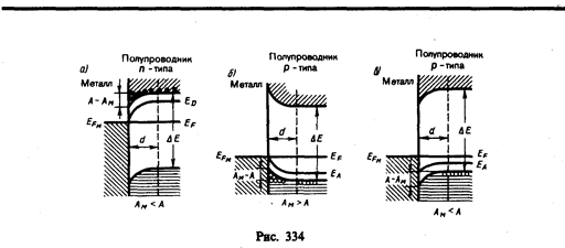 Исходя из приведенных рассуждений, видим, что запирающий контактный сдой возникает при контакте донорного полупроводника с меньшей работой выхода, чем у металла (см. рис. 333, б), и у акцепторного — с большей работой выхода, чем у металла (рис. 333, в).