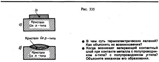 Граница соприкосновения двух полупроводников, один из которых имеет электронную, а другой — дырочную проводимость, называется электронно-дырочным переходом (или p - n -переходом). Эти переходы имеют большое практическое значение, являясь основой работы многих полупроводниковых приборов. p - n -Переход нельзя осуществить просто механическим соединением двух полупроводников. Обычно области различной проводимости создают либо при выращивании кристаллов, либо при соответствующей обработке кристаллов. Например, на кристалл германия n -типа накладывается индиевая «таблетка» (рис. 335, а). Эта система нагревается примерно при 500°С в вакууме или в атмосфере инертного газа; атомы индия диффундируют на некоторую глубину в германий. Затем расплав медленно охлаждают. Так как германий, содержащий индий, обладает дырочной проводимостью, то на границе закристаллизовавшегося расплава и германия n -типа образуется p - n -переход (рис. 335, б).