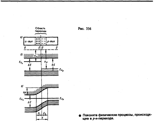 Рассмотрим физические процессы, происходящие в p - n -переходе (рис. 336). Пусть донорный полупроводник (работа выхода — Аn, уровень Ферми — EFn) приводится в контакт (рис. 336, б)с акцепторным полупроводником (работа выхода — Ар, уровень Ферми — ЕF0). Электроны из n -полупроводника, где их концентрация выше, будут диффундировать в p -полупроводник, где их концентрация ниже. Диффузия же дырок происходит в обратном направлении — в направлении р ® п.