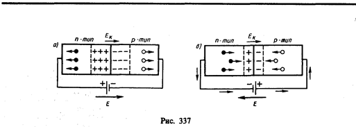Если приложенное к p-n -переходу внешнее электрическое поле направлено противоположно полю контактного слоя (рис. 337, б), то оно вызывает движение электронов в n -полупроводнике и дырок в p- полупроводнике к границе p-n -перехода навстречу друг другу. В этой области они рекомбинируют, толщина контактного слоя и его сопротивление уменьшаются. Следовательно, в этом направлении электрический ток проходит сквозь p-n -переход в направлении от p- полупроводника к n -полупроводнику; оно называется пропускным (прямым).