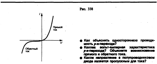 На рис. 338 представлена вольт-амперная характеристика p-n -перехода. Как уже указывалось, при пропускном (прямом) напряжении внешнее электрическое поле способствует движению основных носителей тока к границе p-n -перехода (см. рис. 337, б).В результате толщина контактного слоя уменьшается. Соответственно уменьшается и сопротивление перехода (тем сильнее, чем больше напряжение), а сила тока становится большой (правая ветвь на рис. 338). Это направление тока называется прямым.