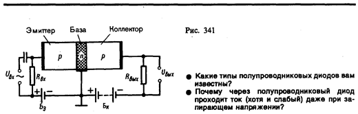 Технология изготовления германиевого плоскостного диода описана в § 249 (см. рис. 325). Распространенными являются также селеновые диоды и диоды на основе арсенида галлия и карбида кремния. Рассмотренные диоды обладают рядом преимуществ по сравнению с электронными лампами (малые габаритные размеры, высокие к.п.д. и срок службы, постоянная готовность к работе и т. д.), но они очень чувствительны к температуре, поэтому интервал их рабочих температур ограничен (от –70 до +120°С). p-n -Переходы обладают не только прекрасными выпрямляющими свойствами, но могут быть использованы также для усиления, а если в схему ввести обратную связь, то и для генерирования электрических колебаний. Приборы, предназначенные для этих целей, получили название полупроводниковых триодов или транзисторов (первый транзистор создан в 1949 г. американскими физиками Д. Бардином, У. Браттейном и У. Шокли; Нобелевская премия 1956 г.).