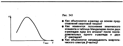 Введение нейтрино (антинейтрино) позволило не только объяснить кажущееся несохранение спина, но и разобраться с вопросом непрерывности энергетического спектра выбрасываемых электронов. Сплошной спектр b –-частиц обусловлен распределением энергии между электронами и антинейтрино, причем сумма энергий обеих частиц равна Е max. В одних актах распада большую энергию получает антинейтрино, в других — электрон; в граничной точке кривой на рис. 343, где энергия электрона равна Е max, вся энергия распада уносится электроном, а энергия антинейтрино равна нулю.