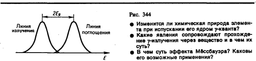 Таким образом, максимумы линий излучения и поглощения сдвинуты друг относительно друга на величину 2 Е я (рис. 344). Используя закон сохранения импульса, согласно которому в рассмотренных процессах излучения и поглощения импульсы g -кванта и ядра должны быть равны, получим