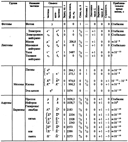 В табл. 8 элементарные частицы объединены в три группы (см. § 272): фотоны, лептоны и адроны. Элементарные частицы, отнесенные к каждой из этих групп, обладают общими свойствами и характеристиками, которые отличают их от частиц другой группы.