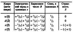), если им приписать характеристики, указанные в табл. 9 (в том числе дробные электрические и барионные заряды). Самое удивительное (почти невероятное) свойство кварков связано с их электрическим зарядом, поскольку еще никто не находил частицы с дробным значением элементарного электрического заряда. Спин кварка равен ½, поскольку только из фермионов можно «сконструировать» как фермионы (нечетное число фермионов), так и бозоны (четное число фермионов).
