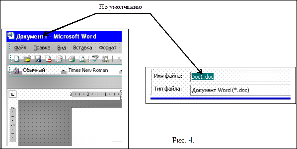 После проведения указанных действий откроется «Рабочее окно» Word и вновь созданному файлу будет присвоено по умолчанию название «Документ 1» (или 2, 3, … и т.д.) и имя «Doc1.doc» (см. рис. 4.), с которыми Вы и будите работать до тех пор, пока их принудительно не поменяете.