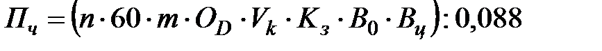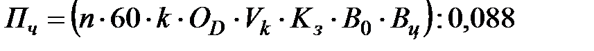 где n – количество установок; к – количество дозаторов (карманов) длясырья; m – количество варочных труб в установке; ОD – число оборотов дозатора, мин.; VK- объем дозатора, м3; KЗ – коэффициент заполнения емкости дозаторов щепой; ВО- объемный вес абсолютно-сухой древесины; ВЦ – выход целлюлозы по абсолютно-сухому веществу из древесины; 0,088 - коэффициент пересчета массы целлюлозы на абсолютно-сухую (12% влажности) и кг в т.
