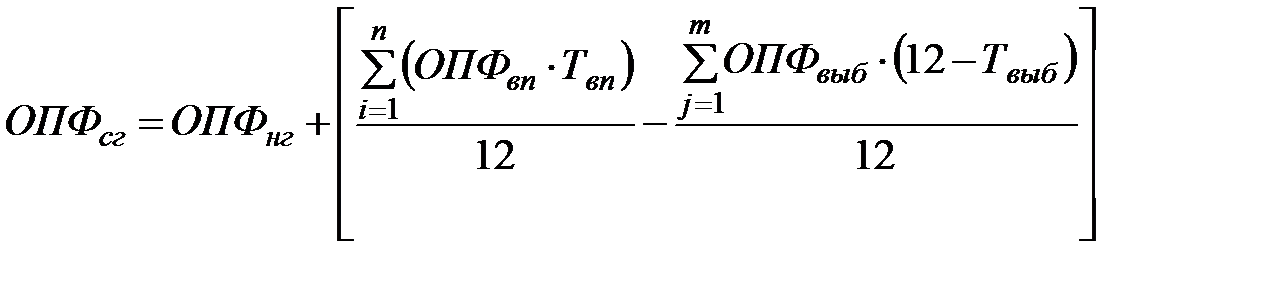 где ОПФнг - стоимость фондов на начало года, руб.; ОПФвп - стоимость вновь поступивших в текущем году основных производственных фондов, руб.; ОПФвыб - стоимость выбывающих фондов в текущем году, руб.; Твп и Твыб - продолжительность эксплуатации вновь поступивших и выбывающих фондов в течение года, месяцев; n - вид (группа) поступивших и m - вид (группа) выбывающих фондов.