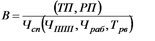 • выработка продукции на одного среднесписочного работника предприятия Чсп, на работника промышленно-производственного персонала Чппп, на одного рабочего Чраб, на единицу рабочего времени Трв. Измеряется как в натуральных единицах (м2, м3, т, шт.), так и в стоимостных (стоимость товарной продукции ТП, реализованной продукции РП):