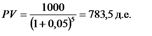 Если через 5 лет инвестору необходимо получить 1000 д.е., то настоящая стоимость денег при той же норме дисконта 5 процентов годовых составит