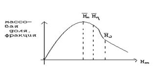 На кривой ММР указаны примерные положения различных средних молекулярных масс. Отношение среднемассовой молекулярной массы к среднечисловой молекулярной массе (