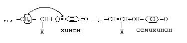 Семихинон, вследствие эффекта сопряжения, обладает малой реакционной способностью, и присоединяется к растущему радикалу, обрывая реакционную цепь.