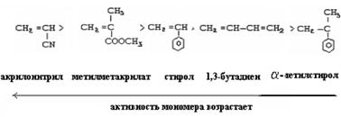 (-СООН) - (кислоты или их эфиры) облегчают атаку двойной связи анионными частицами, вследствие уменьшения электронной плотности такой связи. Они стабилизируют растущие анионы в следствие делокализации отрицательно заряженного иона между углеродом и азотом нитрильной группы СºN.