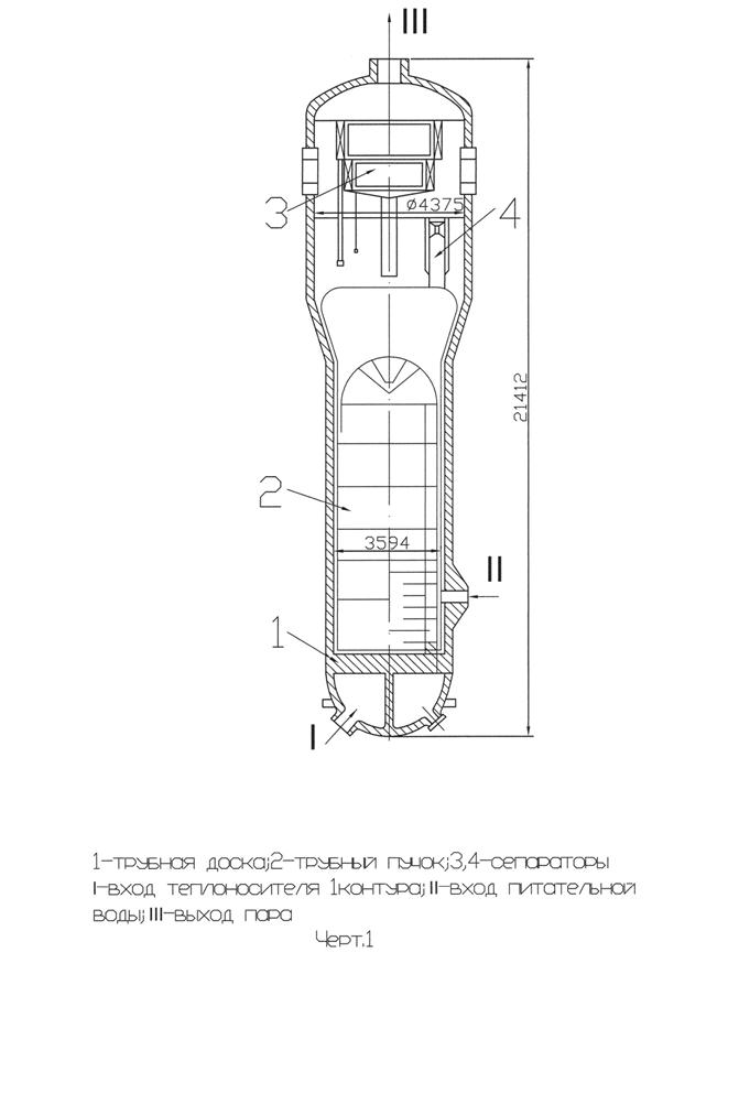 (проект): 1— люк-лаз, 2 — корпус; 3 — кожух трубного пучка; 4 — штуцеры уровнемеров; 5 — жалюзийный сепаратор тор; 6 — люк-лаз; 7 — штуцер аварийного подвода воды; 8 — штуцер непрерывной продувки; 9 — пар пучка труб теплопередающей поверхности; 10 - штуцер периодической продувки; 11 — коллектор теплоносителя; 12 — разделительная обечайка коллектора; 13 — раздающий коллектор питательной воды; 14 — штуцер дренажа