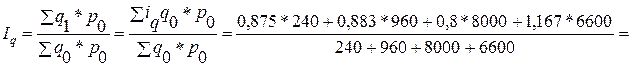 Аналогично вычисляем общий индекс физического объема товарооборота при неизвестном количестве проданных товаров в отчетном периоде, построив индекс объемного признака в форме средней арифметичеcкой с учетом индивидуальных индексов физического объема: