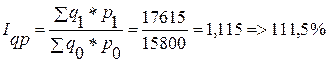 , следовательно, объем товарооборота вырос на 11,5% в отчетном периоде по сравнению с базисным, что в абсолютном выражении составляет (