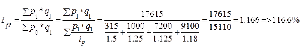 Расчет индивидуальных индексов показал, что по первым трем наименованиям товаров наблюдается сокращение объемов их реализации в отчетном периоде по сравнению с базисным, а именно: по говядине – на 12,5% (87,5% - 100%), птице – на 11,7% (88,3% - 100%), печени – на 20% и только объем реализации яиц вырос на 16,7%.