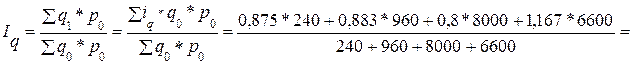 Аналогично вычисляем общий индекс физического объема товарооборота при неизвестном количестве проданных товаров в отчетном периоде, построив индекс объемного признака в форме средней арифметичеcкой (формула 1.8) с учетом индивидуальных индексов физического объема (см. формулу 1.1):